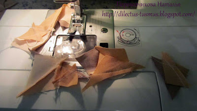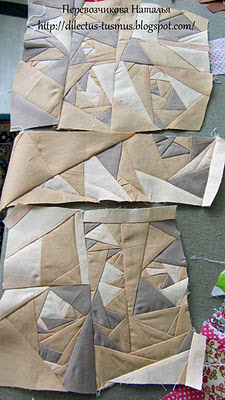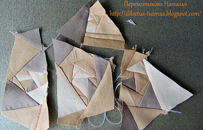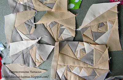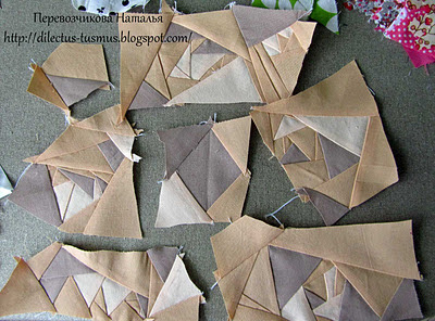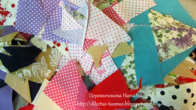 | Мастер-класс по Чумовым Лоскуткам Достаем залежи обрезков хлопковой ткани, любуемся ими. Готовим ножницы. Срезаем все лишнее, превращая лоскуточки в фигуры более-мене правильной формы. Я предпочитаю треугольники. Главное, чтобы стороны не были кривыми, закругленными. http://2.bp.blogspot.com/-ro0TCP....pg Таким образом перерабатывам все наше добро Сортируем, раскладывая по цветам. Берем одну из стопок и начинаем творить - подбираем кусочки с подходящими по размеру сторонами и сшиваем их. Начинаем с самых маленьких! Процесс этот непрерывный. Отрезаем только крайние детали, для того, чтобы нашить новый кусочек. Не забываем периодически отглаживать получившиеся сегменты! Время от времени прикладываем сегменты друг к другу - проверяем на возможность соединить их между собой и тем самым получить бОльший размер сегмента. Дело это не быстрое! Но результат приносит удовлетворение! У меня получилось два полотна авторской ткани. Меньший кусочек я решила пустить на лицо куклы для малыша из предыдущего поста. То же самое проделываем с остальными стопками подготовленных лоскутков.