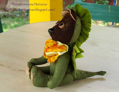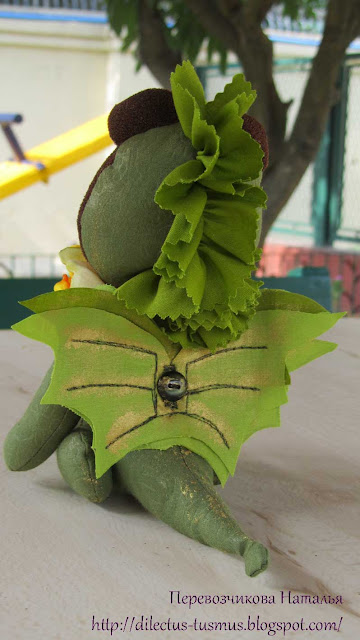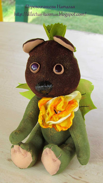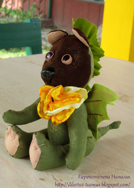 | До Скирмы мне, конечно, еще очень далеко, но попробовать стоило. Принимайте... На носу что?.. Нет, не бородавка и даже не масленица! На носу - Новый Год! И подготовка к нему уже идет полным ходом! Массовое придумывание карнавальных костюмов к этому самому значимому празднику в нашей стране не обошла стороной плюшевых медведей и кукол (но о них - как-нибудь в другой раз...). Вот этот, например, решил принарядиться в рептилию. Да это, в общем логично, ведь грядущий год по китайскому календарю - год дракона, а он имеет непосредственное отношение к динозаврам и как следствие - к рептилиям. А по сему, костюмчик у него самый, что ни на есть подходящий - хвост, спинной гребень, крылья и даже глаза и тесненная фактура ткани наводят на мысль о рептилиях. Но чтобы казаться очень милым дракончиком наш мишка обсыпался золотыми блестками. Он сидит и смотрит на небо в ожидании, когда сойдутся звезды и наконец наступит тот самый год дракона, о котором в последнее время столько разговоров. Кстати, если повнимательнее рассмотреть брошку, то в середине цветка можно обнаружить шмеля! Сделан он из папье-маше в виде бусины, раскрашен акриловыми красками и пришит в сердцевину. Вот такой у нас секретик... А еще у него крылышки отстегиваются...