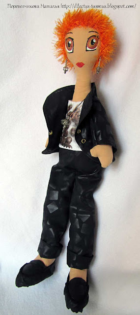 | Они у меня самостоятельные - сами решают какими им быть. Но образ, наверное, пошел от прически - связала ее из травки. с такой прической просилось или маленькое черное платье или черный брючный костюм. для платья подходящей ткани в закромах не нашла, а вот для костюма отыскала. ну а дальше надо было что-то под пиджак одеть - отыскала остаток от футболки и салфетку для декупажа... ну и обуться надо обязательно - покопалась в выкройках, нашла макасины... все само друг за друга цепляется. а вообще, я всегда думаю, как бы я у себя в гардеробе эти вещи сочетала, что с чем одела бы. мне так легче одеть куклу